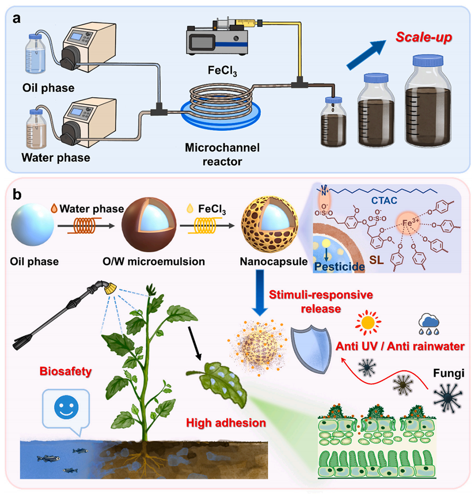 Scheme 1.(a)具有规模化生产潜力的低能耗微流控农药纳米封装平台。(b)农药纳米胶囊的制备策略与优势示意图,包括高粘附性、抗紫外光解、耐雨水冲刷、控释性能及良好的生物安全性。