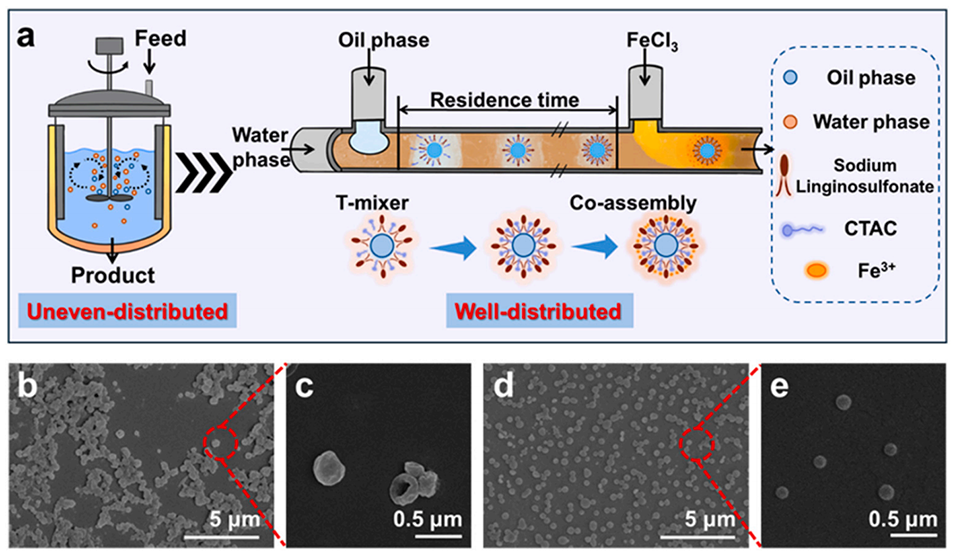 图1.(a)搅拌反应器与微流控反应器中农药纳米胶囊的制备流程示意图。在搅拌反应器(b,c)和微流控反应器(d,e)中制备的吡唑醚菌酯纳米胶囊的扫描电镜图像。