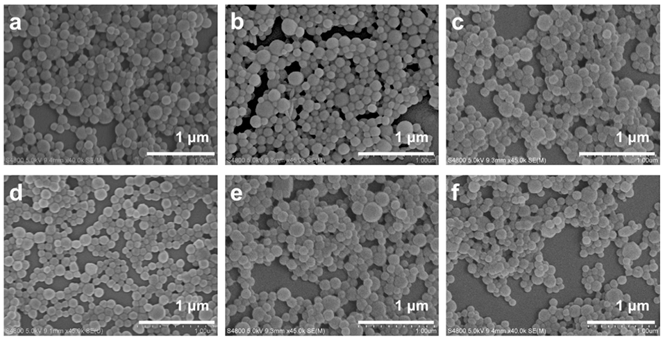 图2.不同农药纳米胶囊的扫描电镜图像:(a)阿维菌素;(b)烯啶虫胺;(c)毒死蜱;(d)吡唑醚菌酯;(e)苯醚甲环唑;(f)戊唑醇。