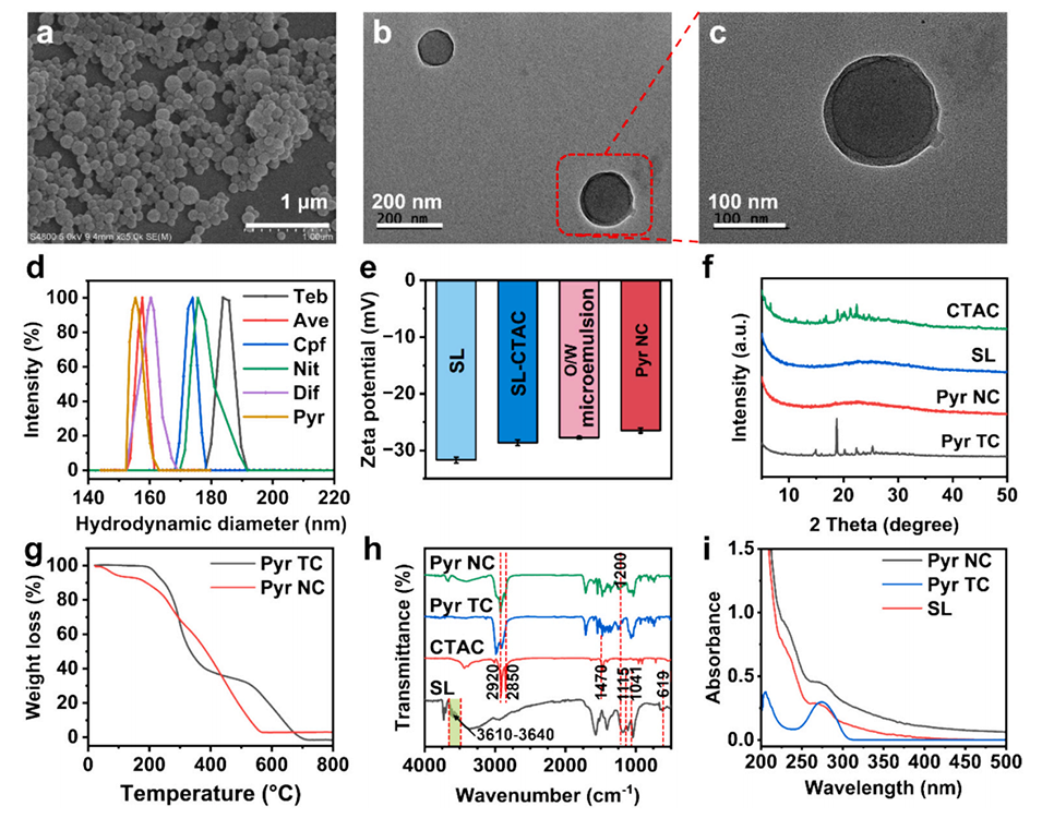图3.吡唑醚菌酯纳米胶囊的表征:(a)扫描电镜图像;(b,c)透射电镜图像;(d)不同农药纳米胶囊的流体力学尺寸;(e)zeta电位;(f)X射线衍射图谱;(g)热重分析曲线;(h)傅里叶变换红外光谱;(i)紫外-可见光谱。