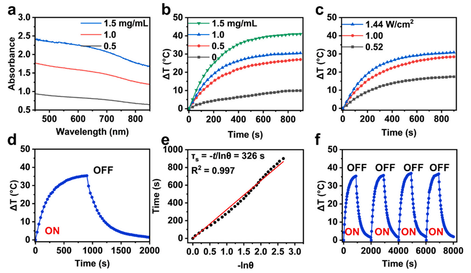 图4.(a)不同浓度吡唑醚菌酯纳米胶囊水分散液的电子吸收光谱。(b)808 nm激光(1.00 W/cm²)照射下不同浓度吡唑醚菌酯纳米胶囊水分散液的温度变化。(c)1.0 mg/mL吡唑醚菌酯纳米胶囊水分散液在不同功率密度808 nm激光照射下的温度变化。(d)1.0 mg/mL吡唑醚菌酯纳米胶囊水分散液经808 nm激光(1.00 W/cm²)照射15 min后关闭激光的温度变化。(e)根据冷却阶段收集的线性时间相关数据计算的热传递时间常数。(f)1.0 mg/mL吡唑醚菌酯纳米胶囊水分散液在808 nm激光(1.00 W/cm²)开关循环下的温度变化。