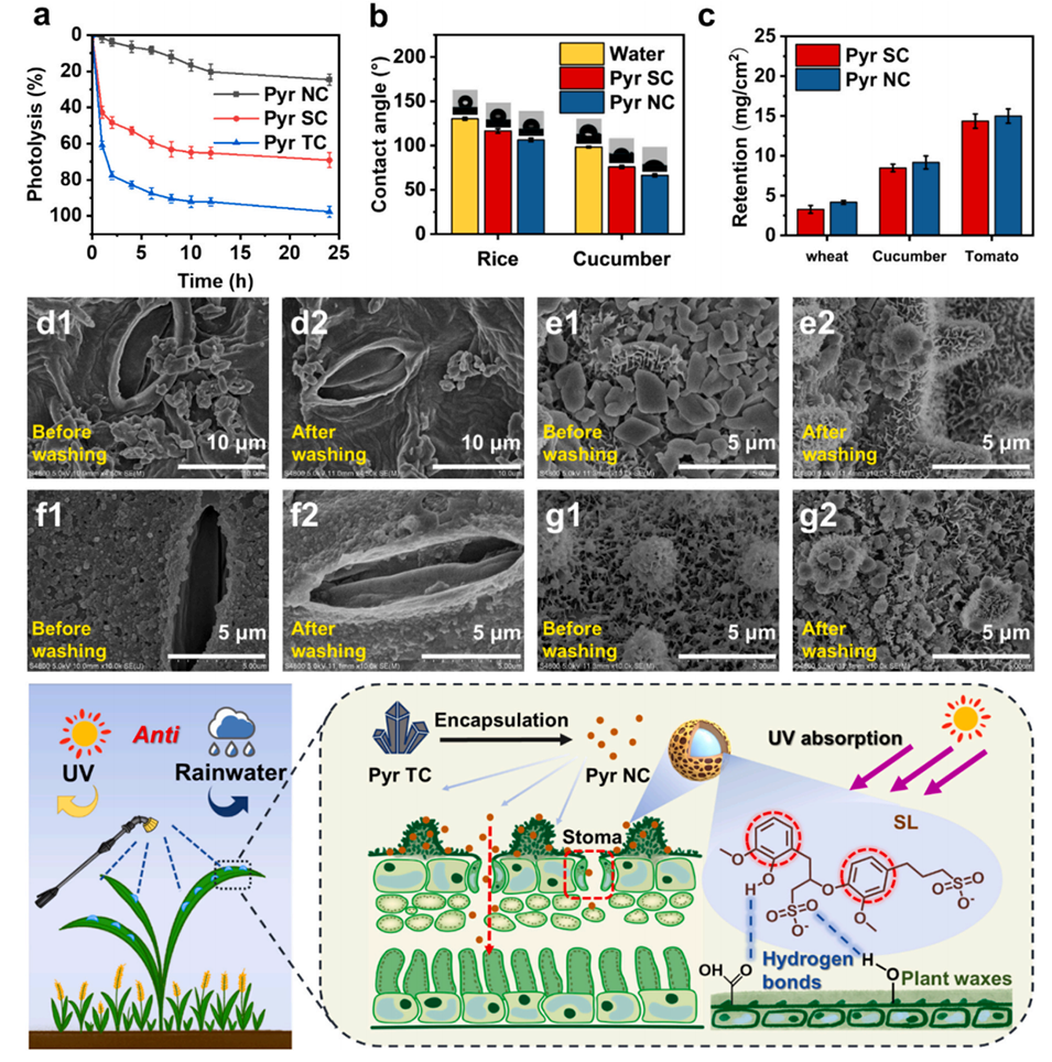 图5.(a)吡唑醚菌酯原药(Pyr TC)、商业悬浮剂(Pyr SC)和纳米胶囊(Pyr NCs)在254 nm紫外光照射下的光解速率(n=3)。(b)水、Pyr SC和Pyr NCs在水稻和黄瓜叶片上的接触角(n=3)。(c)叶面喷施条件下Pyr SC和Pyr NCs在小麦、黄瓜和番茄叶片上的保留率(n=5)。水冲洗前后Pyr SC在作物叶片上的扫描电镜图像:(d)黄瓜叶;(e)水稻叶。水冲洗前后Pyr NCs在作物叶片上的扫描电镜图像:(f)黄瓜叶;(g)水稻叶。