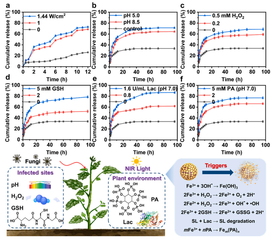 图6.在含乙醇(乙醇/水,2:3,v/v)和0.1%吐温-80的水介质中,吡唑醚菌酯从纳米胶囊中的刺激响应控释(n=3):(a)808 nm激光;(b)pH;(c)H2O2;(d)谷胱甘肽(GSH);(e)漆酶(Lac);(f)植酸(PA)。图示为刺激响应机制。