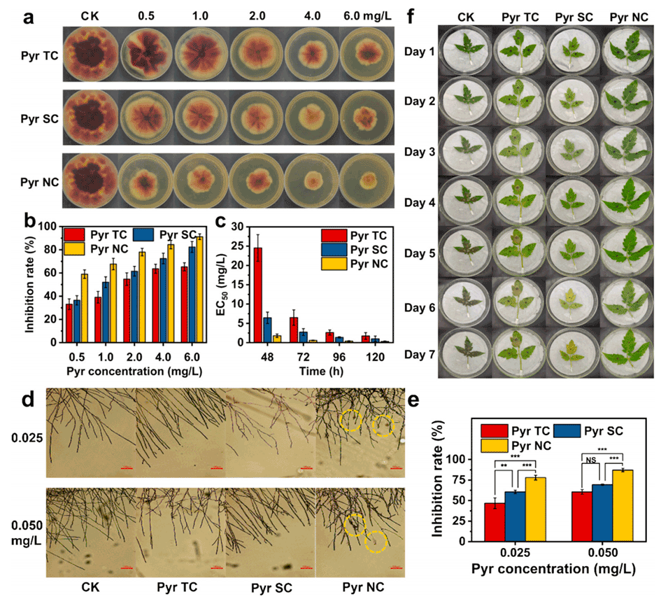 图7.(a)Pyr TC、Pyr SC和Pyr NCs在不同浓度下对禾谷镰刀菌的120小时体外杀菌活性,(b)不同浓度下的抑制率,以及(c)不同培养时间的半数有效浓度(EC50)(n=3)。(d)禾谷镰刀菌与不同浓度Pyr TC、Pyr SC和Pyr NCs孵育后的菌丝形态(红色标尺,100 μm)和(e)孢子萌发抑制率(n=3;** p<0.01,*** p<0.001,NS=无显著性)。(f)Pyr TC、Pyr SC和Pyr NCs对番茄叶片上灰葡萄孢菌的体内防治效果。