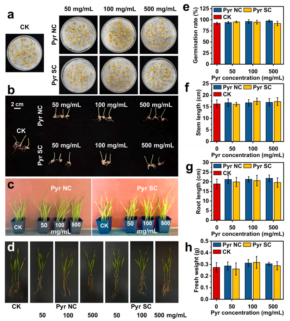 图8.不同浓度Pyr SC和Pyr NCs对小麦种子萌发和幼苗的生物安全性评估(n=3):(a,b)种子萌发情况;(c,d)幼苗生长情况;(e)7天后的发芽率;(f)14天后幼苗的根长、(g)茎长和(h)鲜重。