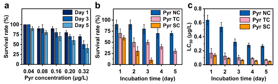 图9.对斑马鱼的急性毒性(n=3):(a)不同浓度Pyr NCs在不同培养时间下的斑马鱼存活率;(b)0.16 μg/L浓度下Pyr TC、Pyr SC和Pyr NCs在不同培养时间下的斑马鱼存活率;(c)Pyr TC、Pyr SC和Pyr NCs在不同培养时间下的半数致死浓度(LC50)。