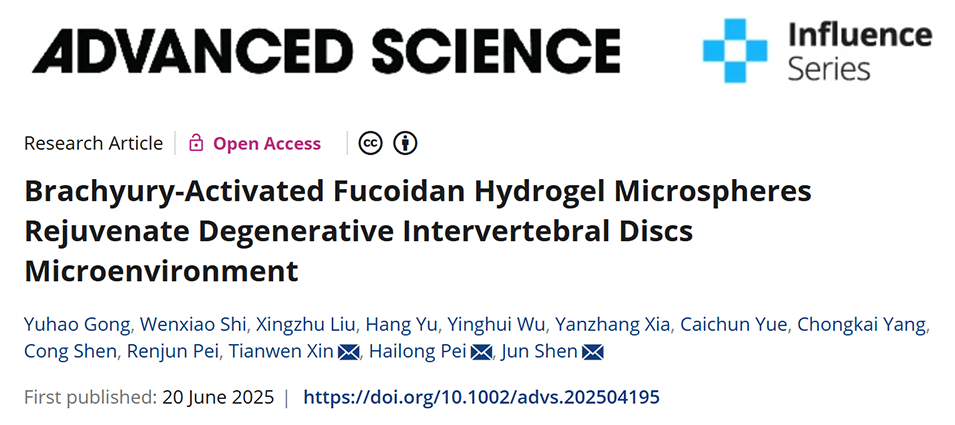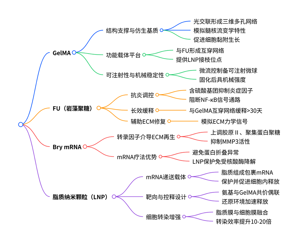 近期,苏州市立医院沈军教授、Tianwen Xin与苏州大学裴海龙副教授等人合作,开发出一种基于水凝胶微球与脂质纳米颗粒的创新递送系统(BLNP@GF)。该系统通过缓释岩藻多糖实现抗炎作用,并递送Brachyury mRNA以促进细胞外基质再生,从而有效改善退变椎间盘微环境。相关研究以“Brachyury‐Activated Fucoidan Hydrogel Microspheres Rejuvenate Degenerative Intervertebral Discs Microenvironment”为题目,发表在期刊《Advanced Science》上。