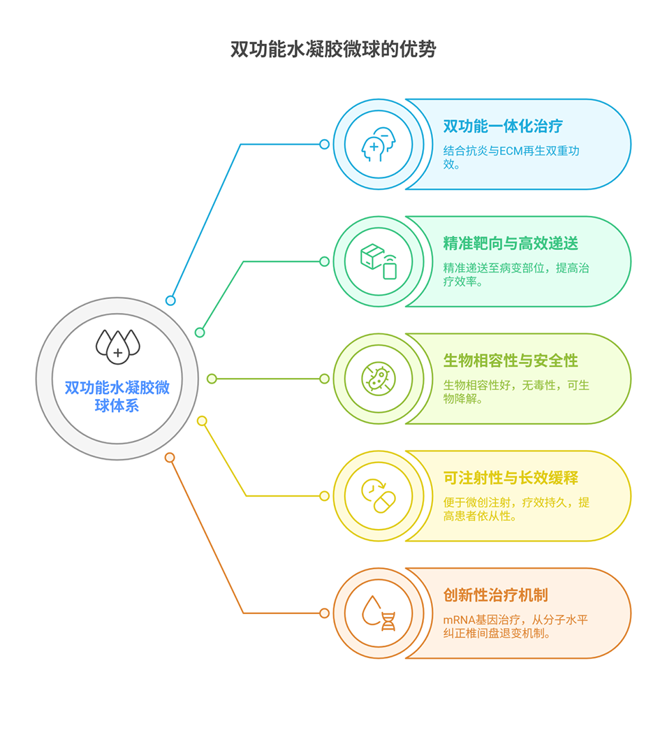 下腰痛(LBP)已成为全球性健康挑战,主要由椎间盘退变(IVDD)引起。传统治疗方法难以有效遏制IVDD进展,而侵入性手术虽常被采用,却无法恢复椎间盘的生物力学功能。IVDD 的关键病理特征在于髓核(NP)组织的细胞外基质(ECM)代谢紊乱以及促炎微环境的形成,二者相互促进形成恶性循环,加速了组织退化。鉴于此,研发出一种能够同时调控炎症微环境、恢复ECM合成功能的创新治疗策略显得尤为关键。
