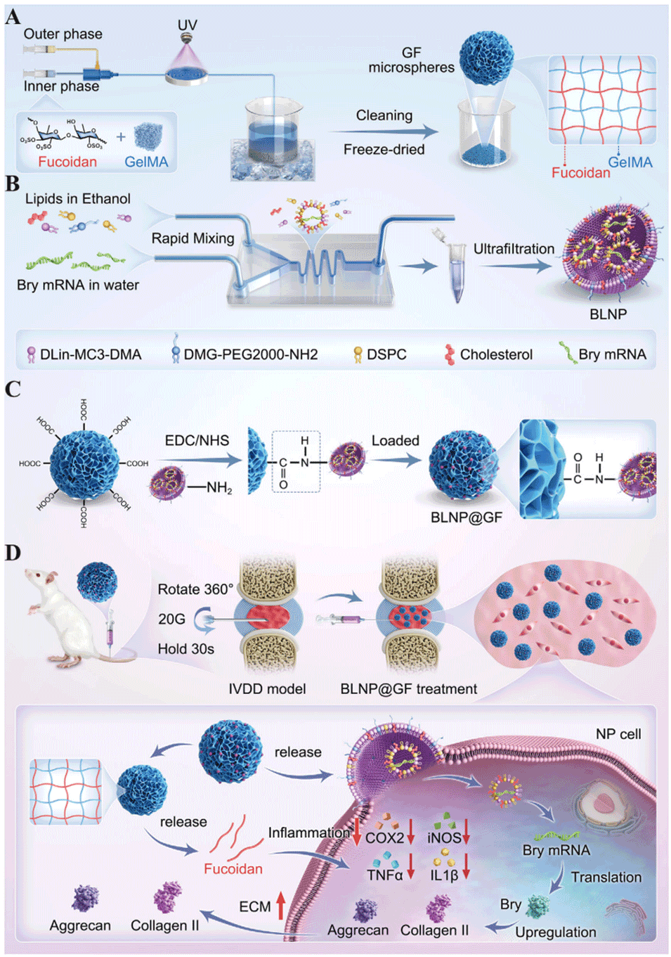 1、本研究利用微流控技术制备GelMA/岩藻聚糖(FU)双组分水凝胶(GF)微球,通过化学接枝负载Bry mRNA的脂质纳米颗粒(BLNP),构建BLNP@GF微球。