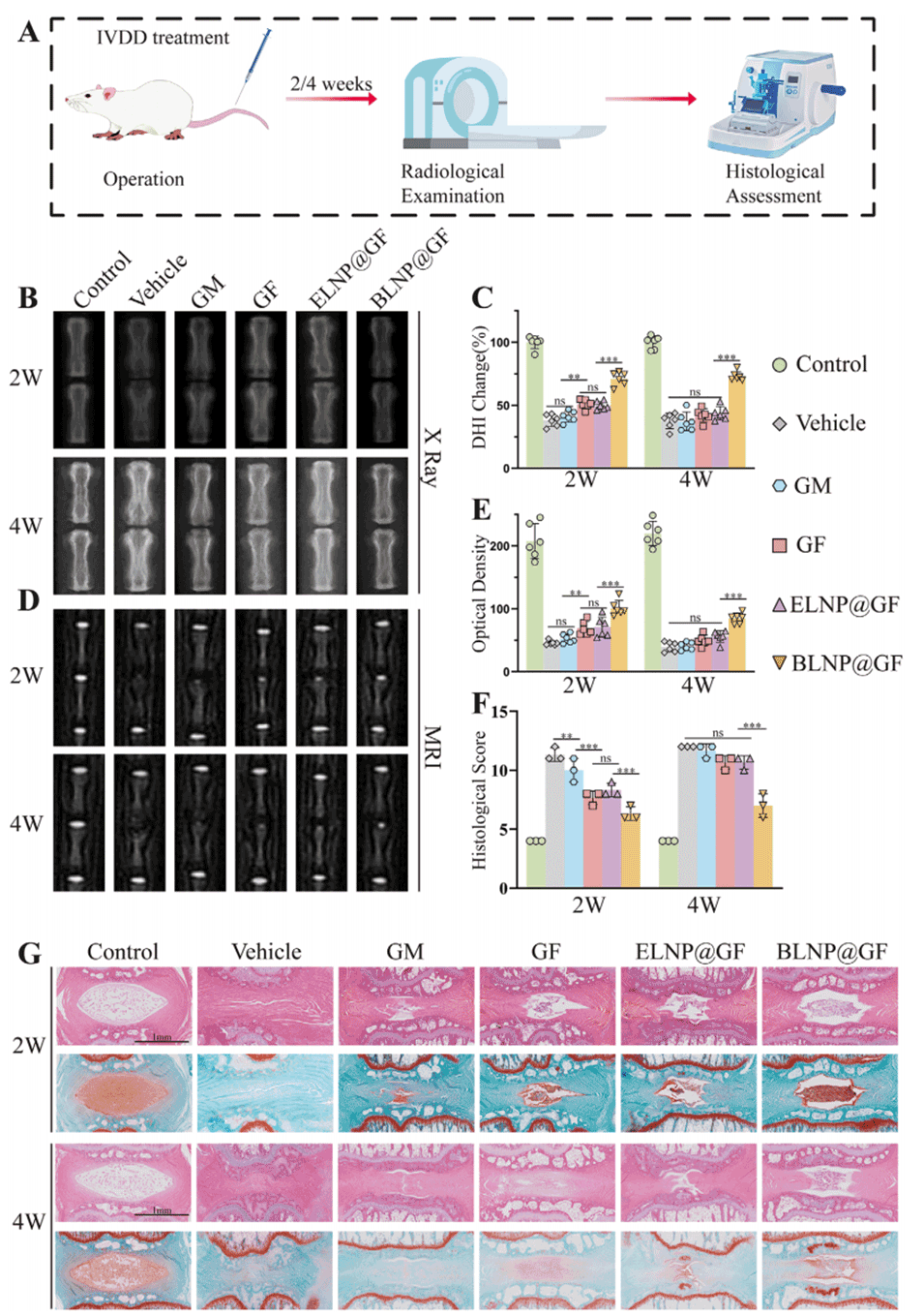 3、在大鼠尾穿刺IVDD模型中,局部注射BLNP@GF可显著改善NP组织ECM重塑,提高椎间盘高度指数(DHI)和MRI信号强度,延缓退变进程。