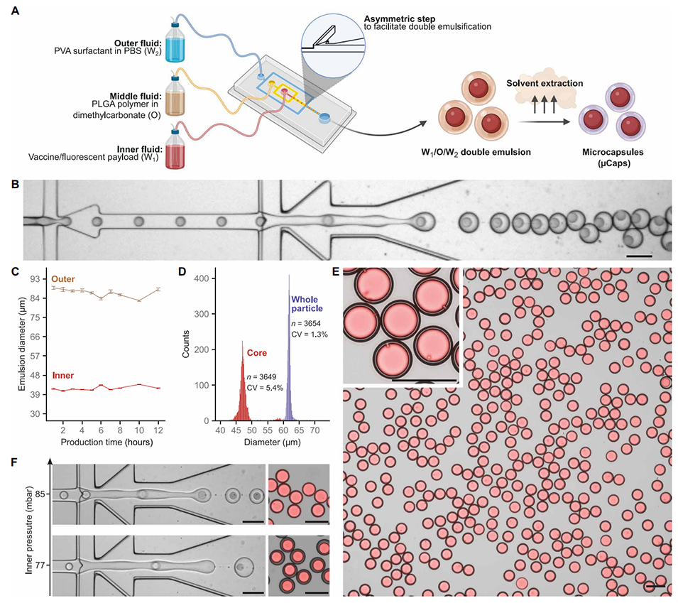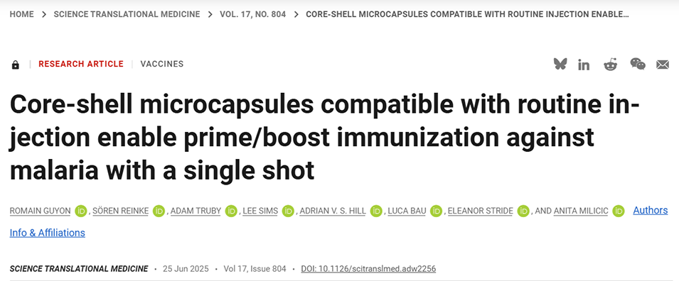 近期,牛津大学詹纳研究所团队开发了一种新型微胶囊技术,有望通过单次注射实现疟疾疫苗的初免和加强免疫。利用微流控芯片将R21疟疾疫苗封装在聚合物微胶囊中,这些微胶囊能够在注射后数周至数月内延迟释放疫苗成分,从而模拟传统的多次接种效果。在小鼠模型中验证了这种微胶囊疫苗的免疫效果,发现其诱导的抗体反应与标准的两次接种方案相当,保护效力达到85%,且该技术具有良好的可扩展性和临床应用潜力。相关研究以“Core-shell microcapsules compatible with routine injection enable prime/boost immunization against malaria with a single shot”为题,发表在期刊《Science Translational Medicine》上。