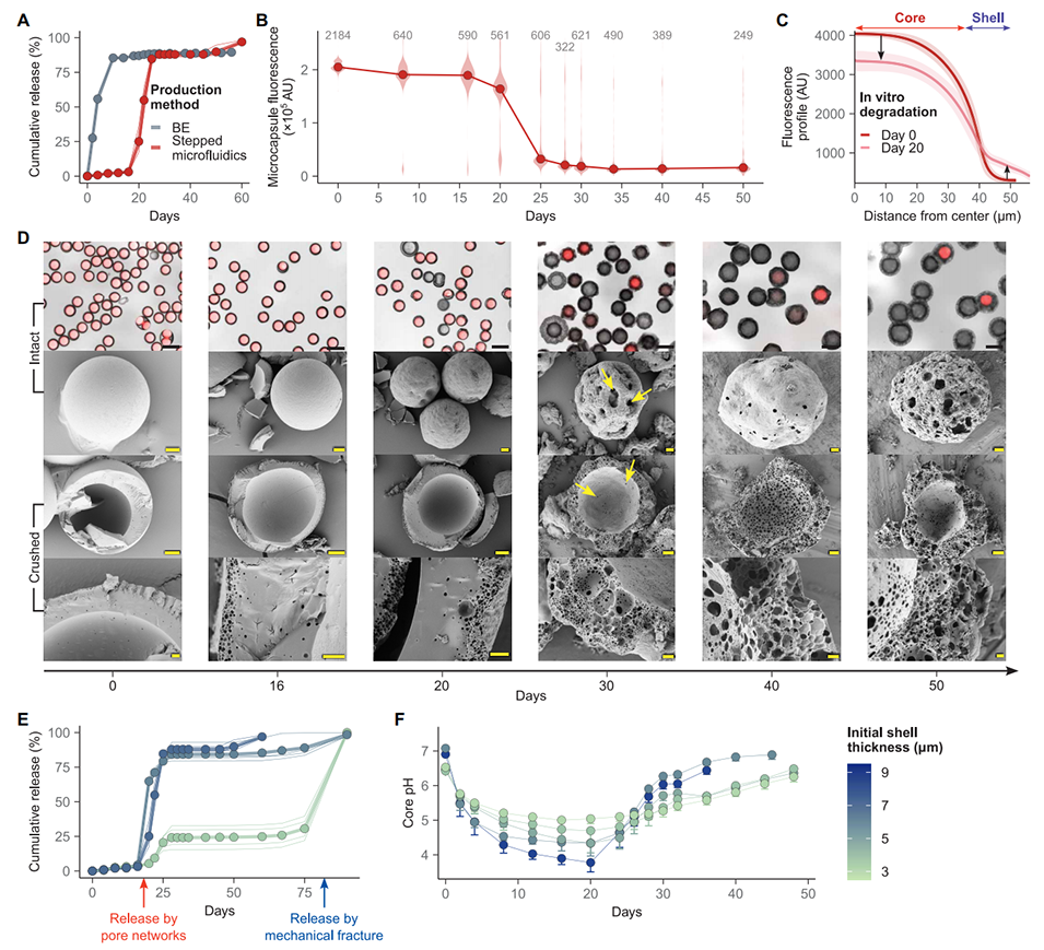 图2.微胶囊核壳结构实现体外延迟突释,释放动力学及核心pH依赖于壳层厚度