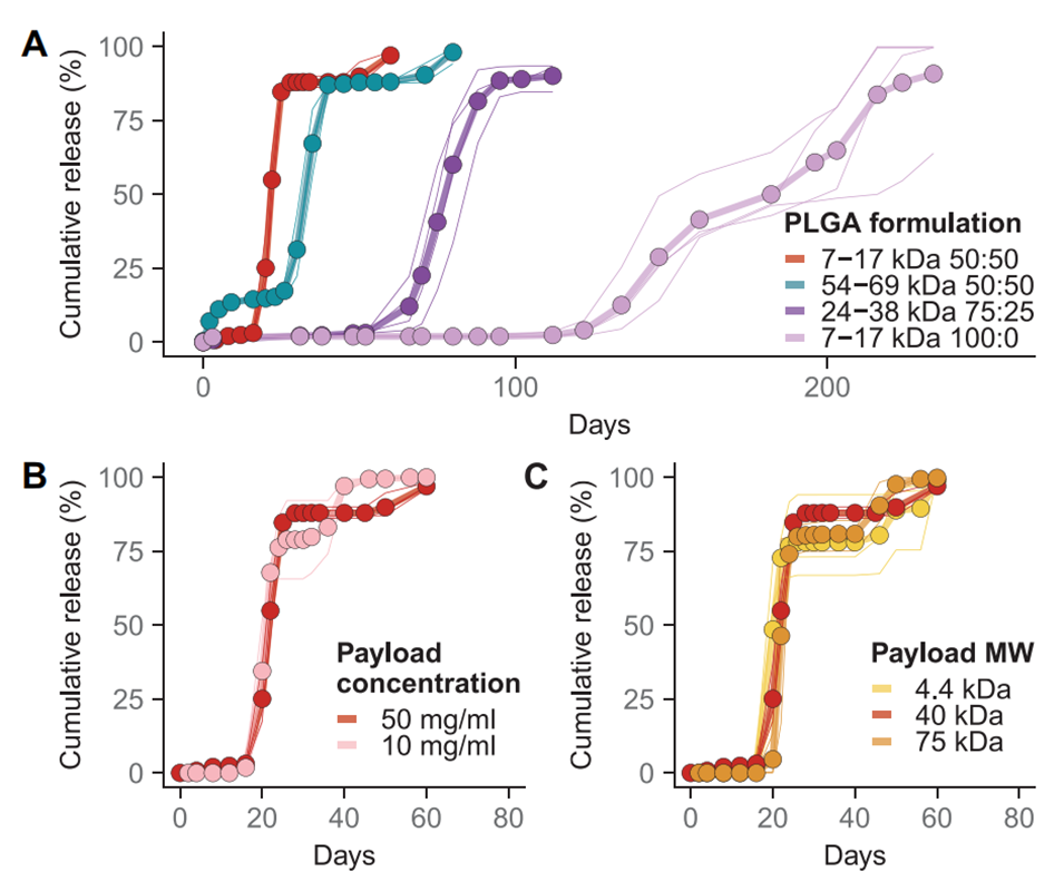 3、这些微胶囊粒径均一、包封率>99.9%,其释放动力学可通过聚合物配方进行调控,且存储稳定、可常规注射。