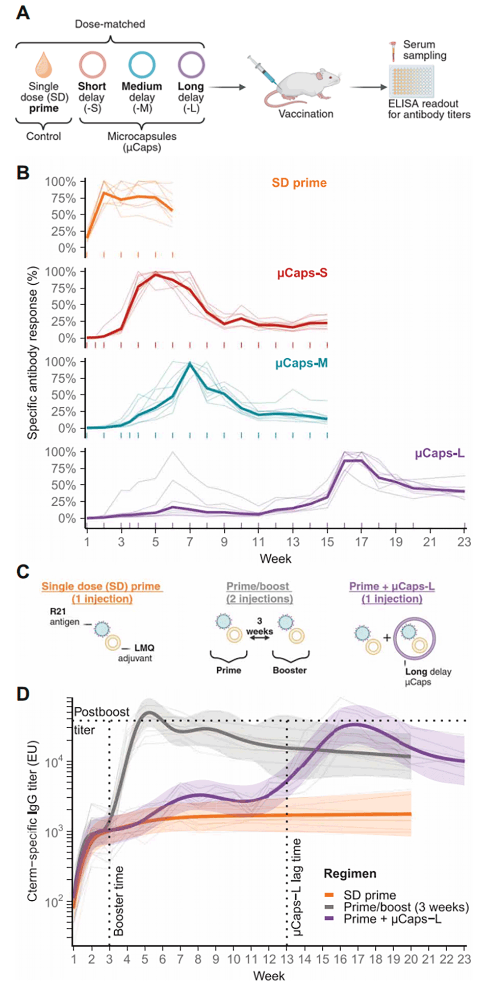 1、本研究开发了可延迟释放加强剂量的核壳微胶囊平台。通过阶梯式芯片微流控技术,将R21疫苗封装于PLGA微胶囊,实现注射后数周至数月延迟释放。
