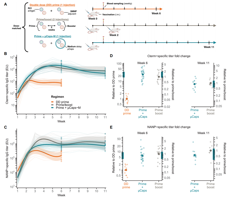 图5.单次注射prime+μCaps-M诱导的免疫原性与标准基础-加强方案相当