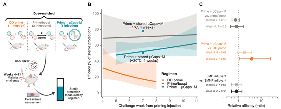 图6.微胶囊递送的加强剂量在小鼠体内引发抗疟疾保护效力