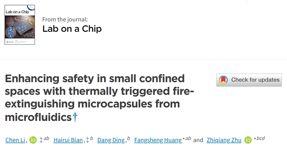 近期,中国科学技术大学黄芳胜研究员、朱志强副教授等人利用微流体流动聚焦技术,实现了对全氟己酮的高效微胶囊化,制备出热触发灭火微胶囊(FEMs),并将其拓展为二维灭火贴片(FEPs),为解决小密闭空间火灾扑救难题提供了新方案。相关研究以“Enhancing safety in small confined spaces with thermally triggered fire-extinguishing microcapsules from microfluidics”为题目,发表在期刊《Lab on a Chip》上。