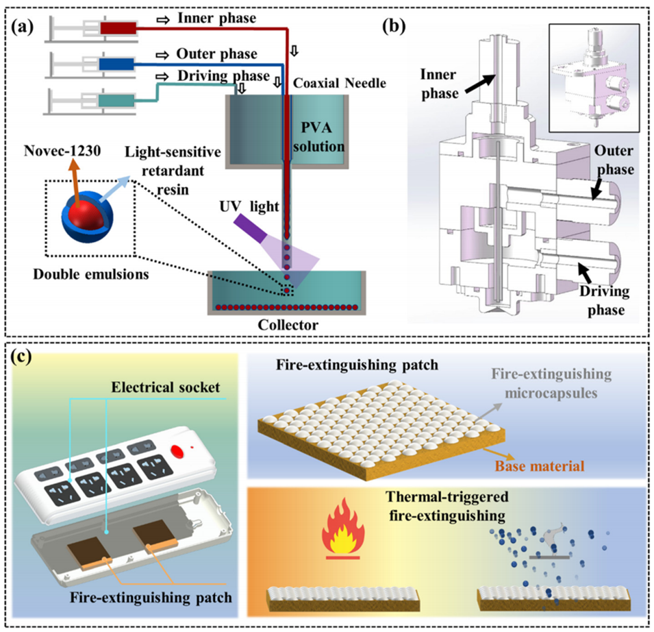 图1(a):采用同轴流动聚焦法制备全氟己酮灭火微胶囊(FEMs)的实验系统示意图。该系统包含喷嘴、高精度注射泵、照明设备和紫外灯等多个组件。(b):同轴流动聚焦喷嘴示意图。这种喷嘴能确保流体在指定位置汇聚,使生成的FEMs形成结构清晰的核-壳结构。(c):用于提升电器插座安全性的热触发灭火贴片(FEPs)示意图。在插座设计中融入热触发FEPs后,它可作为保护层,防止温度进一步升高,降低潜在风险。