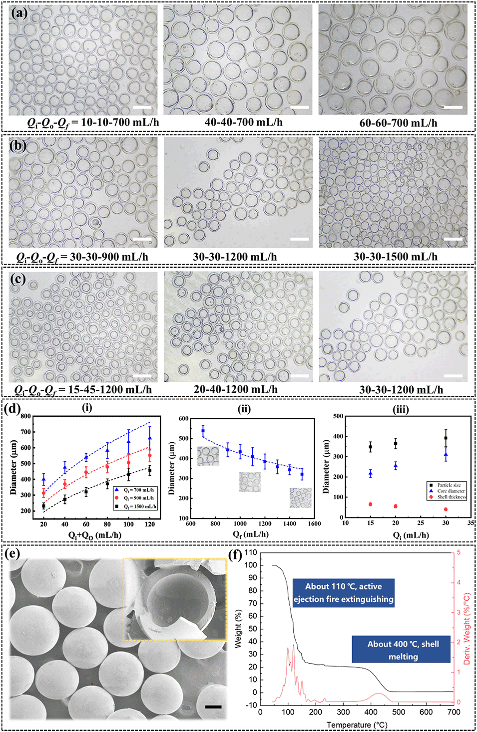 图2:在不同三相流体流量(内相为全氟己酮、外相为光固化树脂、聚焦相为聚乙烯醇水溶液)条件下,通过同轴流动聚焦法制备的全氟己酮FEMs在直径(a,b)和厚度(c)上的形态差异。(d):上述流量组合下微胶囊尺寸的统计数据。(i):α值分别为3.679、3.315、3.360;(ii):α=3.467;(iii):内相流量与外相流量之和为60mL/h,聚焦相流量为1200mL/h。(e):全氟己酮FEMs的扫描电镜图像。(f):全氟己酮FEMs的热重分析图。(a)-(c)的比例尺:600μm。