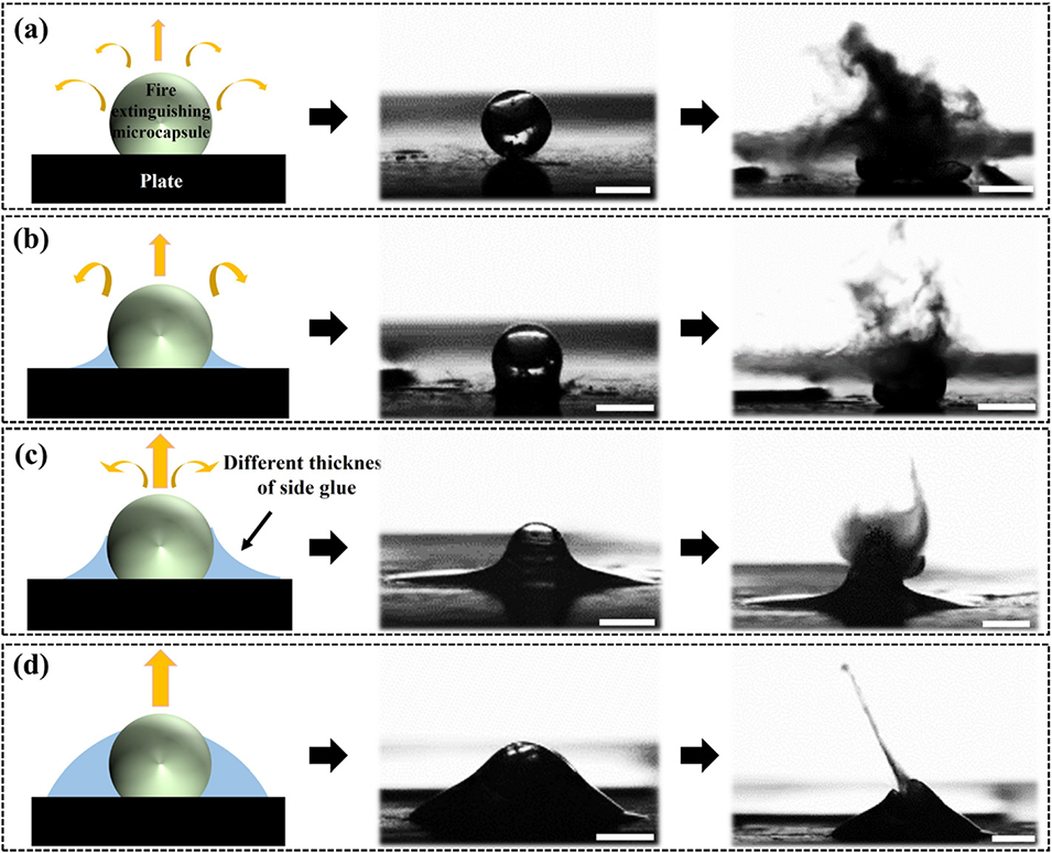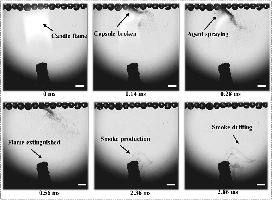 图5:利用FEMs扑灭蜡烛火焰过程的即时高速摄影图像。整个过程包括微胶囊破裂、全氟己酮喷射、火焰熄灭及烟雾产生。比例尺:500μm。