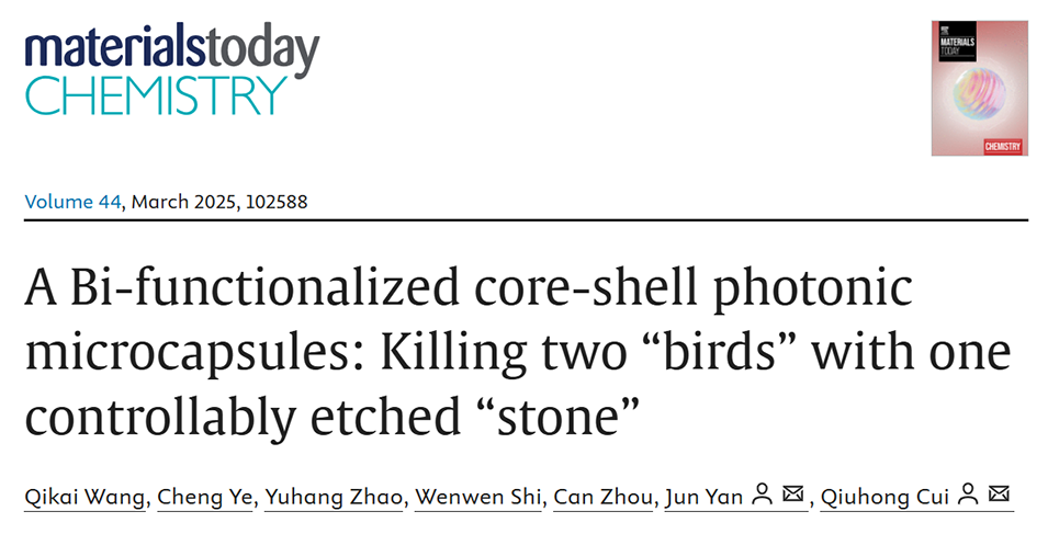 核壳结构光子微胶囊(PhMCs)相比均质光子晶体微球具有更丰富的结构色,应用价值更高。近期,北京交通大学崔秋红教授和闫君副教授等人结合微流控与可控蚀刻技术,成功制备出结构色可控的响应性PhMCs,其完全蚀刻产物可用于金属离子检测,部分蚀刻产物因具有三重禁带特性可实现光学防伪功能。相关研究以“A Bi-functionalized core-shell photonic microcapsules: Killing two “birds” with one controllably etched “stone””为题目,发表于期刊《Materials Today Chemistry》。
