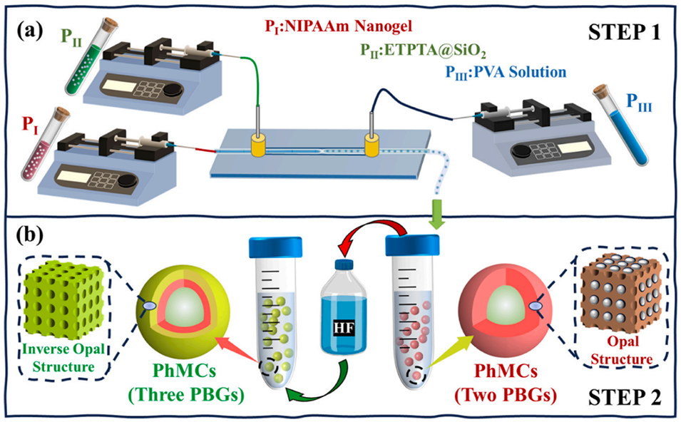 利用水包油包水(W/O/W)微流控装置,通过调节三相流体(核层NIPAAm纳米凝胶、壳层ETPTA@SiO2悬浮液、外层PVA溶液)的流速和质量分数,精准控制PhMCs的尺寸、壳层厚度及内部纳米颗粒的排列周期。