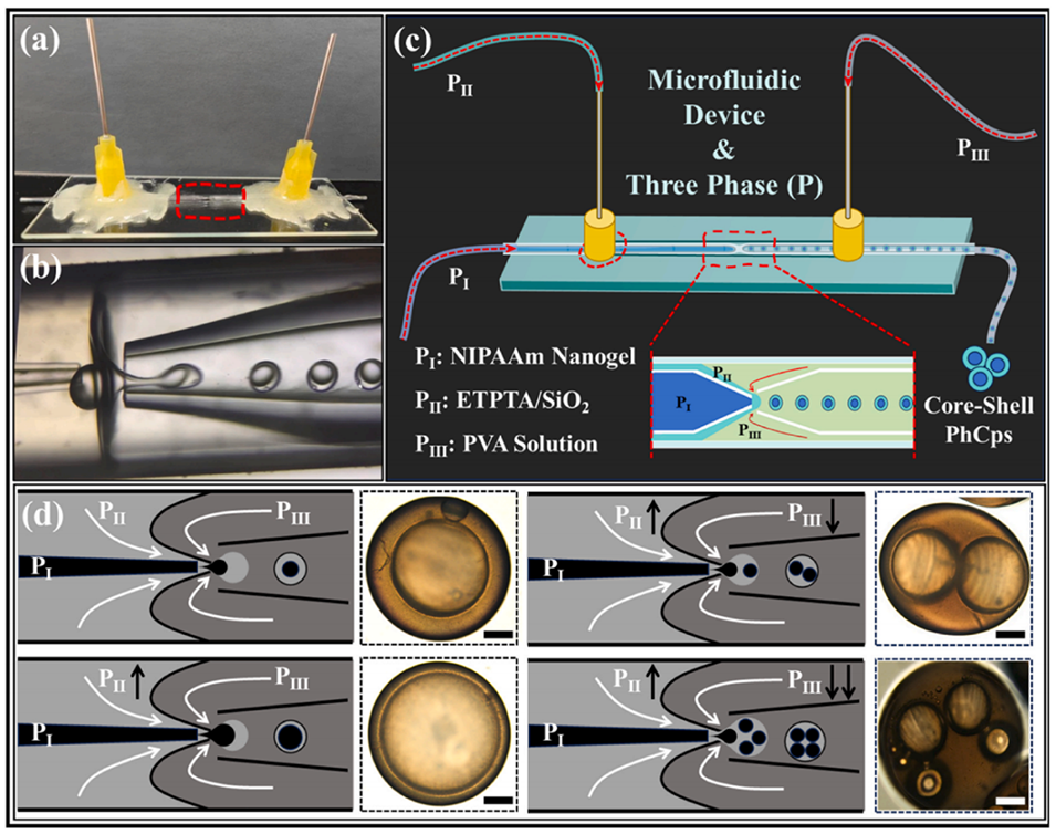 图1.(a)微流控装置图像;(b)水包油包水(W/O/W)微流控装置内的相界面图像;(c)带流体的微流控装置示意图;(d)流体分析示意图(插图:PhMCs的光学显微镜图像,比例尺=40μm;白色箭头:PⅠ、PⅡ和PⅢ的流动方向,黑色箭头:PⅠ、PⅡ和PⅢ的流速变化)。