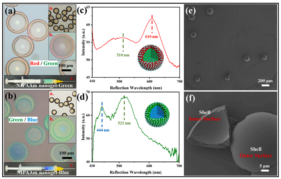 图2.(a)外红内绿PhMCs在反射模式下的光学显微镜图像(插图:a. PhMCs在透射模式下的光学显微镜图像;b. PhMCs在反射模式下的光学显微镜图像;c.核层NIPAAm纳米凝胶的对应图像);(b)外绿内蓝PhMCs在反射模式下的光学显微镜图像(插图:a. PhMCs在透射模式下的光学显微镜图像;b. PhMCs在反射模式下的光学显微镜图像;c.核层NIPAAm纳米凝胶的对应图像;(c)外红内绿PhMCs的反射光谱;(d)外绿内蓝PhMCs的反射光谱;(e)PhMCs的扫描电镜图像;(f)PhMCs壳层的扫描电镜图像。