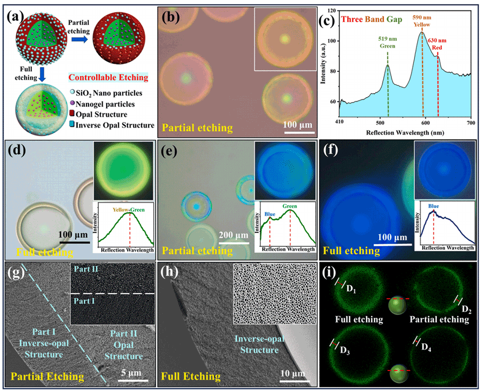 图3.(a)PhMCs可控蚀刻示意图;(b)部分蚀刻的外红内绿PhMCs在反射模式下的光学显微镜图像;(c)部分蚀刻的外红内绿PhMCs的对应反射光谱图;(d)完全蚀刻的外红内绿PhMCs在反射模式下的光学显微镜图像(插图:对应反射光谱图);(e)部分蚀刻的外绿内蓝PhMCs在反射模式下的光学显微镜图(插图:对应反射光谱图);(f)完全蚀刻的外绿内蓝PhMCs在反射模式下的光学显微镜图像(插图:对应反射光谱图);(g)部分蚀刻的PhMCs壳层横截面的扫描电镜图像(插图:放大图像);(h)完全蚀刻的PhMCs壳层横截面的扫描电镜图像(插图:放大图像);(i)部分蚀刻和完全蚀刻的PhMCs的共聚焦激光扫描显微镜图像。