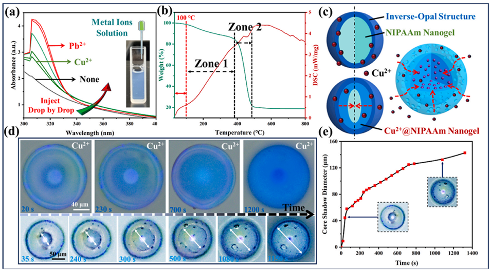 图4.(a)逐滴加入金属离子溶液后NIPAAm纳米凝胶的紫外-可见吸收光谱;(b)完全蚀刻的PhMCs的热重-差示扫描量热图;(c)基于完全蚀刻的PhMCs的金属离子初步检测器机理示意图;(d)完全蚀刻的光子微胶囊PhMCs在Cu2+溶液中的变化图;(e)完全蚀刻的PhMCs在Cu2+溶液中核层阴影直径随时间变化曲线。