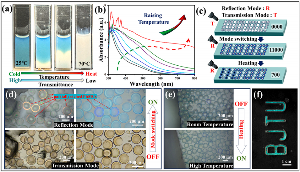 图5.(a)NIPAAm纳米凝胶随温度升高的变化;(b)NIPAAm纳米凝胶的紫外-可见吸收光谱随温度升高的变化曲线;(c)基于部分蚀刻的PhMCs的光学防伪模型示意图;(d)封装在水凝胶膜中的未蚀刻和部分蚀刻的PhMCs在反射和透射模式下的光学显微镜图;(e)温度升高时,封装在水凝胶膜中的部分蚀刻的PhMCs在反射模式下的光学显微镜图;(f)部分蚀刻的PhMCs在水凝胶中的图案化实例。
