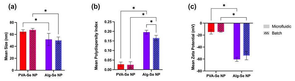 图2.分散在水中的Se NPs的特性。(a)平均尺寸。(b)多分散指数(PDI)。(c)平均zeta电位。(误差棒代表标准差,n=3次独立重复实验,采用双向方差分析及Tukey多重比较检验,*=p≤0.05)。