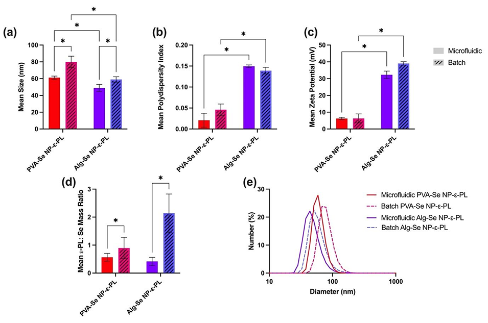 图3.分散在水中的Se NP-ε-PLs。(a)尺寸。(b)多分散指数(PDI)。(c)zeta电位。(d)ε-PL与硒的质量比。(e)尺寸分布。(误差棒代表标准差,n=3次独立重复实验,(a-d)采用双向方差分析及Tukey多重比较检验,*=p≤0.05)。