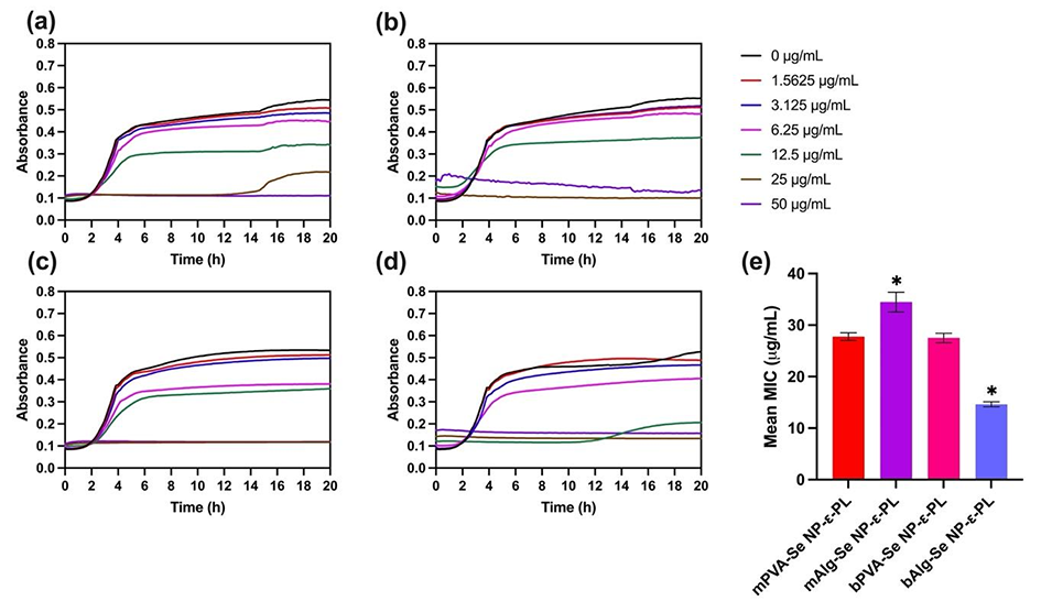 图5.不同浓度的(a)微流控PVA-Se NP-ε-PL、(b)微流控Alg-Se NP-ε-PL、(c)批量PVA-Se NP-ε-PL、(d)批量Alg-Se NP-ε-PL处理大肠杆菌的生长曲线。(e)每种Se NP-ε-PL对大肠杆菌的最小抑菌浓度(MIC)。(误差棒代表标准差,n=3次独立重复实验,(e)采用单向方差分析及Tukey多重比较检验,*=p≤0.05)。