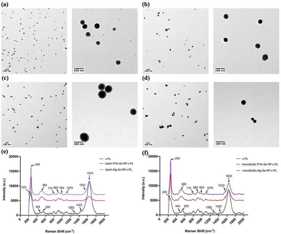 图4. Se NP-ε-PL表征。透射电镜(TEM)图像:(a)微流控制备的PVA-Se NP-ε-PL。(b)微流控制备的Alg-Se NP-ε-PL。(c)批量制备的PVA-Se NP-ε-PL。(d)批量制备的Alg-Se NP-ε-PL。拉曼光谱:(e)批量制备的Se NP-ε-PL。(f)微流控制备的Se NP-ε-PL。