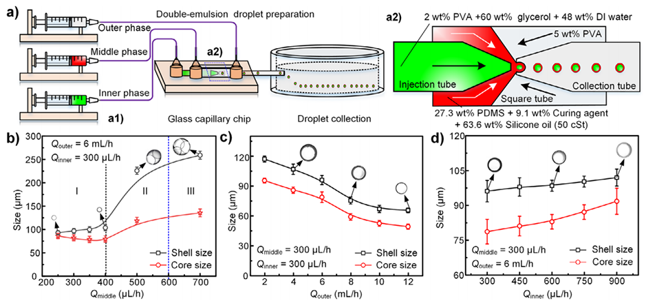 图2.双乳液液滴模板的生成。a)用于生成双乳液液滴的微流控系统示意图(a1)。a2)液滴生成器件关键结构及制备所用溶液的视图。b)中间油相流速对液滴尺寸的影响。c)外部水相流速对液滴尺寸的影响。d)液滴尺寸与内部相流速的关系图。