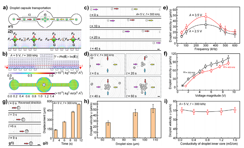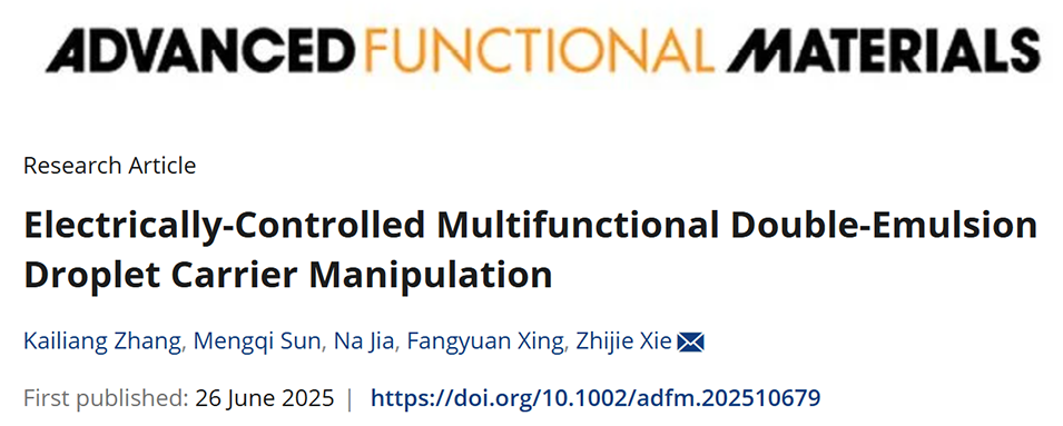 双乳液液滴载体的灵活操控在细胞培养、货物递送等诸多应用中意义重大。然而,现有技术受限于对专用平台和特殊功能材料的依赖,且功能单一,实用性受限。近期,东北林业大学机电工程学院解志杰教授、张凯亮副教授团队提出了一种基于可控交流电场的创新方法,实现了双乳液液滴载体的运输、旋转及内核释放等多功能操控,其载体外壳采用常见且无害的材料,可通过调节电信号参数灵活调控操控效果。相关研究以“Electrically-Controlled Multifunctional Double-Emulsion Droplet Carrier Manipulation”为题目,发表在期刊《Advanced Functional Materials》上。