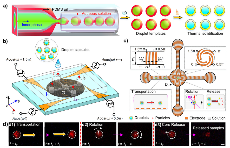 图1.电控双乳液液滴载体操控示意图。a)双乳液液滴载体的制备过程。b)用于液滴载体操控的微流控器件概览。c)微通道中电极的排布及液滴载体多功能操控示意图。d)可控电场下液滴载体按需运输(d1)、旋转(d2)和内核释放(d3)的图像。比例尺:75μm。