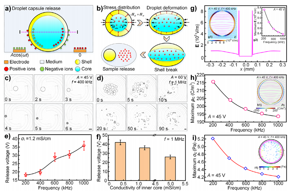 3、在设计的微器件中,液滴先通过行波介电泳效应从通道入口运输至目标区域,再在旋转电场下旋转以测量其电特性,最后在足够的界面电场麦克斯韦应力作用下,外壳变薄破裂,释放纳米颗粒和抗癌药物。