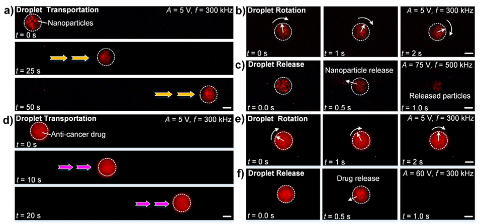 图6.含纳米级聚苯乙烯颗粒和抗癌药物的液滴载体的电操控。a–c)包裹荧光纳米颗粒的液滴载体的运输、旋转和释放。比例尺:75μm。d–f)含抗癌药物盐酸阿霉素的液滴载体的运输、旋转和释放。比例尺:150μm。