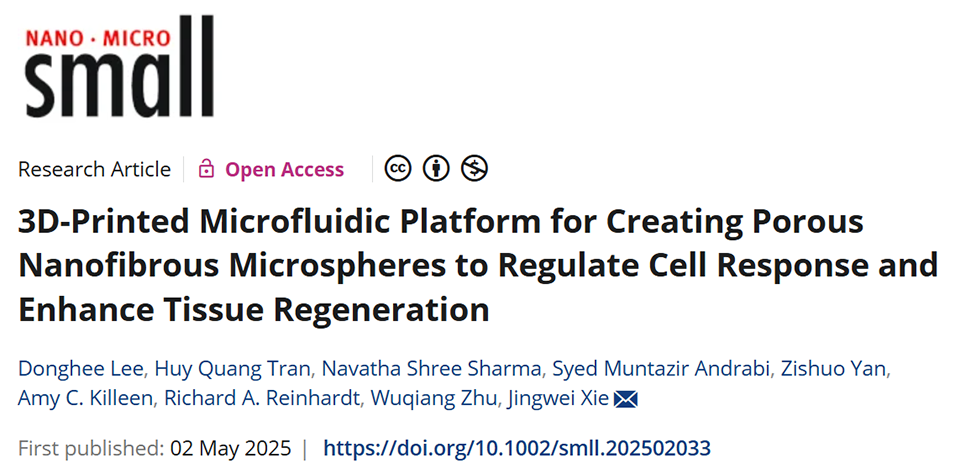 近期,美国内布拉斯加大学医学中心谢敬伟教授团队开发出一种创新的3D打印微流控平台,用于高效制备结构可精确调控的多孔纳米纤维微球(PNMs)。该平台成功实现了PNM的大规模生产与生物活性多肽功能化修饰,并在体外细胞实验及大鼠皮下植入模型中显著促进了成骨、血管生成,抑制了炎症反应,展现出优异的组织整合与再生能力。相关研究以“3D‐Printed Microfluidic Platform for Creating Porous Nanofibrous Microspheres to Regulate Cell Response and Enhance Tissue Regeneration”为题,发表在著名国际学术期刊《Small》上。