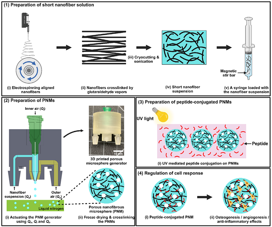 图1.肽偶联PNMs的制备流程及其在调节细胞反应中应用的示意图。1)短纳米纤维悬浮液的制备:对定向电纺PLGA:GelMA纤维膜进行冷冻切割,并将短纳米纤维与明胶均质化。2)PNMs的制备:通过3D打印多孔微球发生器控制纳米纤维悬浮液、内部空气和外部空气的流速,经冷冻干燥和戊二醛(GA)交联处理。3)肽偶联PNMs的制备:利用紫外交联将BMP-2、QK或AF-1肽固定在PNMs上。4)细胞反应调节:偶联BMP-2、QK和AF-1肽的PNMs分别可促进人骨髓基质细胞(hBMSCs)成骨、人脐静脉内皮细胞(HUVECs)血管生成,并对巨噬细胞发挥抗炎作用。