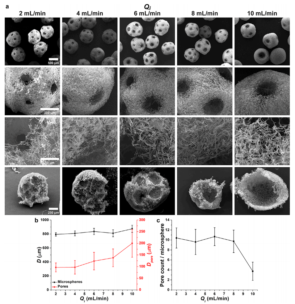 图2.内部空气流速(Qi)对PNMs形态和尺寸的影响。a)PNMs的扫描电子显微镜(SEM)图像,底部为横截面视图。b)PNMs直径(D)和孔隙直径(Dpore)随Qi的变化。c)每个微球的孔隙数量。外部空气流速(Qo)和纳米纤维悬浮液流速(Qs)分别维持在12和1mL/min。(n=15)