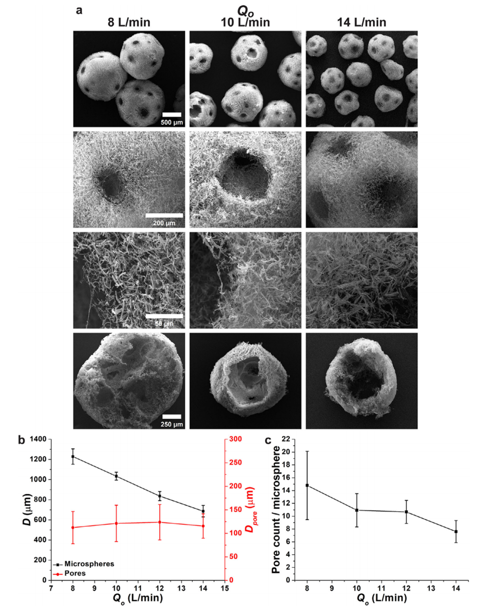 图3.外部空气流速(Qo)对PNMs形态和尺寸的影响。a)PNMs的SEM图像,底部为横截面视图。b)PNMs直径(D)和孔隙直径(Dpore)随Qo的变化。c)每个微球的孔隙数量。内部空气流速(Qi)和纳米纤维悬浮液流速(Qs)分别维持在6和1mL/min。(n=15)