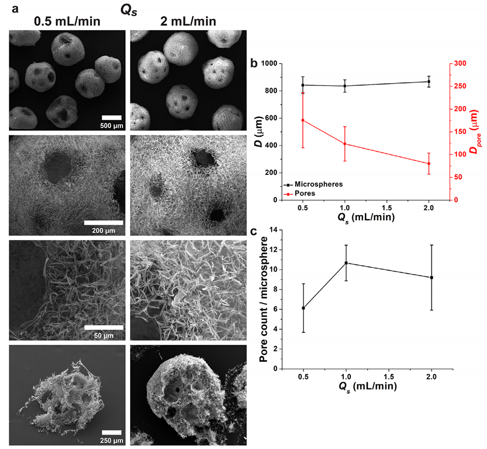 图4.纳米纤维悬浮液流速(Qs)对PNMs形态和尺寸的影响。a)PNMs的SEM图像,底部为横截面视图。b)PNMs直径(D)和孔隙直径(Dpore)随Qs的变化。c)每个微球的孔隙数量。外部空气流速(Qo)和内部空气流速(Qi)分别维持在12和6mL/min。(n=15)