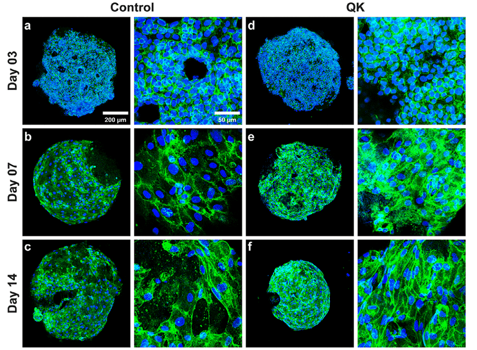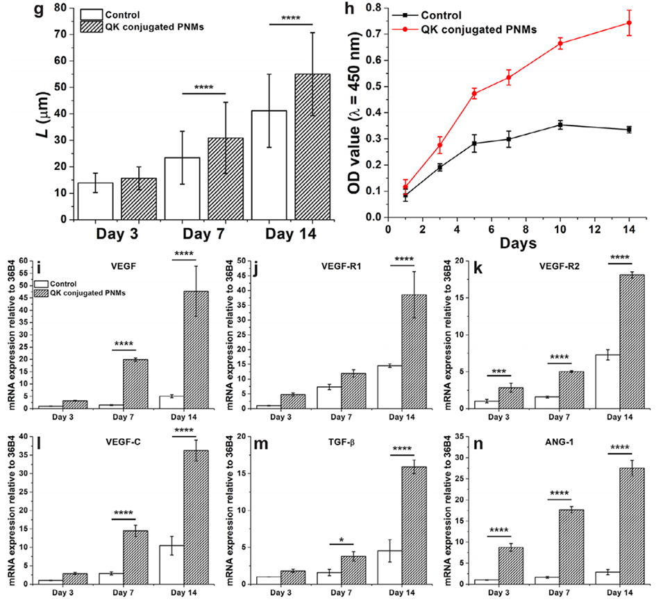 图7.接种于未偶联和偶联QK肽的PNMs上的HUVECs的血管生成分化。a–f)共聚焦显微镜图像显示培养3、7和14天后HUVECs中CD31的表达(有无QK肽偶联)。绿色:CD31;蓝色:DAPI。g)HUVECs长轴长度随培养时间的变化。(n = 35–248个细胞)h)HUVECs在对照组和QK偶联PNMs上的增殖情况(n=3)。i–n)血管生成标志物的mRNA表达水平,包括VEGF(i)、VEGF-R1(j)、VEGF-R2(k)、VEGF-C(l)、TGF-β(m)和ANG-1(n)。(n=4,****:p≤0.0001,***:p≤0.001,**:p≤0.01,*:p≤0.05)