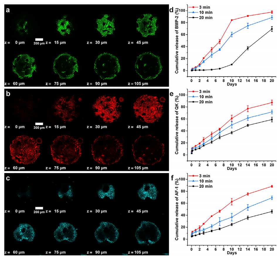 图5.偶联BMP-2、QK和AF-1肽的PNMs。a–c)偶联BMP-2(a)、QK(b)和AF-1(c)肽的PNMs的Z-stack共聚焦显微镜图像。荧光图像显示肽在PNMs上的分布:绿色为BMP-2肽,红色为QK肽,青色为AF-1肽。d–f)BMP-2(d)、QK(e)和AF-1(f)肽从偶联PNMs中的累积释放曲线,以紫外交联时间为变量。(n=2)