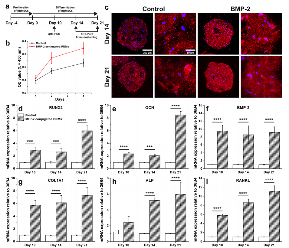 图6.接种于PNMs上的hBMSCs的成骨分化。a)实验设计示意图:成骨分化前hBMSCs在PNMs上培养4天以进行增殖。b)hBMSCs在对照组和BMP-2偶联PNMs上的增殖情况。(n=3)c)共聚焦显微镜图像显示培养14和21天后hBMSCs中骨钙素的表达(有无BMP-2肽偶联)。红色:骨钙素;蓝色:DAPI。d–i)成骨标志物的mRNA表达水平,包括RUNX2(d)、OCN(e)、BMP-2(f)、COL1A1(g)、ALP(h)和RANKL(i)。(n=4,****:p≤0.0001,***:p≤0.001,**:p≤0.01,*:p≤0.05)