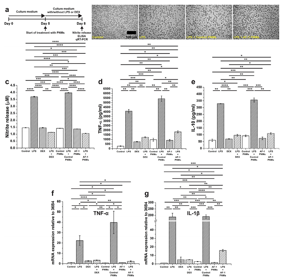 图8. AF-1肽偶联 PNMs(AF-1 PNMs)的抗炎作用。a)实验设计示意图:将人单核细胞培养5天分化为巨噬细胞,从第5天起,向培养基中加入脂多糖(LPS)、地塞米松(DEX)、LPS与DEX的混合物等外源性因子,并开始用PNMs进行处理。b)经LPS和PNMs处理的巨噬细胞的代表性显微镜图像。c)采用格里斯试剂法(Greiss assay)测定亚硝酸盐释放量。d-e)通过酶联免疫吸附测定(ELISA)定量检测TNF-α(d)和IL-10(e)的水平。f-j)炎症标志物的mRNA表达水平,包括TNF-α(f)、IL-1β(g)、IL-6(h)、IL-10(i)和ARG1(j)。(n=4,****:p≤0.0001,***:p≤0.001,**:p≤0.01,*:p≤0.05)