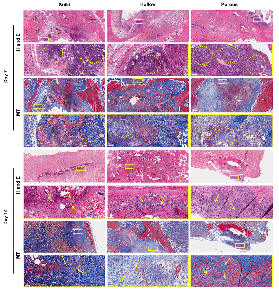 图9.微球在大鼠体内的皮下植入实验。代表性的苏木精-伊红(H&E)染色(前两行)和马松三色(MT)染色(后两行)图像显示第7天时实心、中空和多孔纳米纤维微球(黄色圆圈)的存在及其在第14天的完全整合。黄色箭头:微球位置。比例尺:1mm(低倍镜,上行),100μm(高倍镜,下行)。